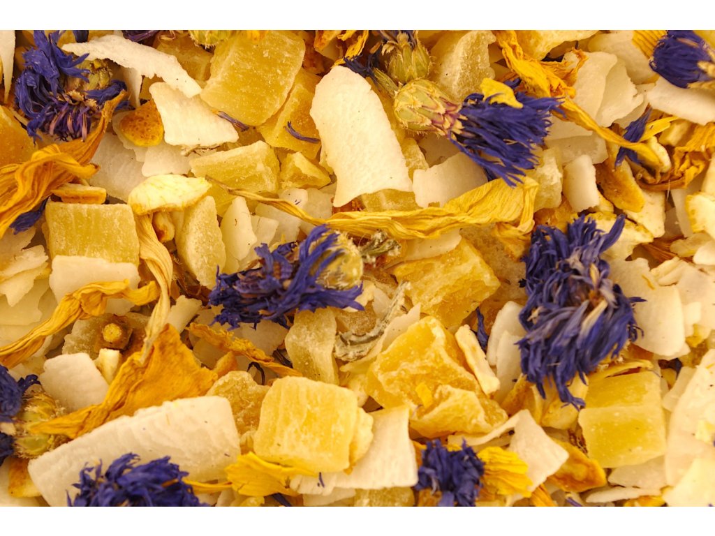 Kandizovaný ananás (kocky), kandizované mango (kocky), kokos (plátky), citrónová kôra, kvet nevädze, kvet slnečnice, prírodná exotická aróma.