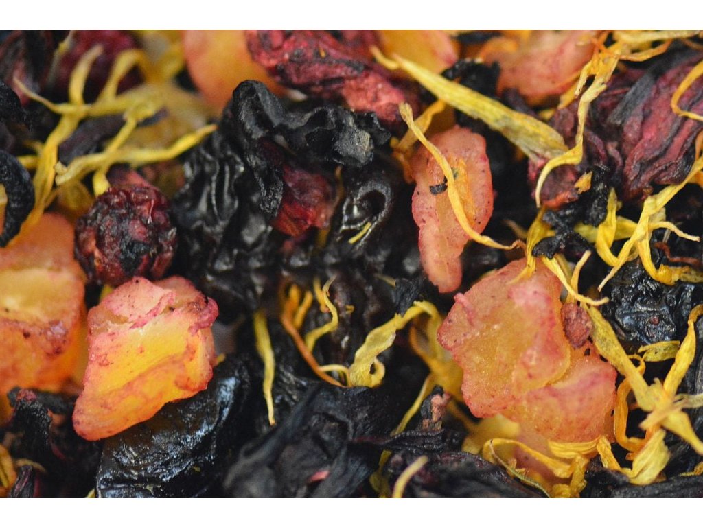 Ibištek, mango, višne (22 %), čierne hrozno (Thomson raisins), aróma, červené ríbezle, kvet nechtíka.
