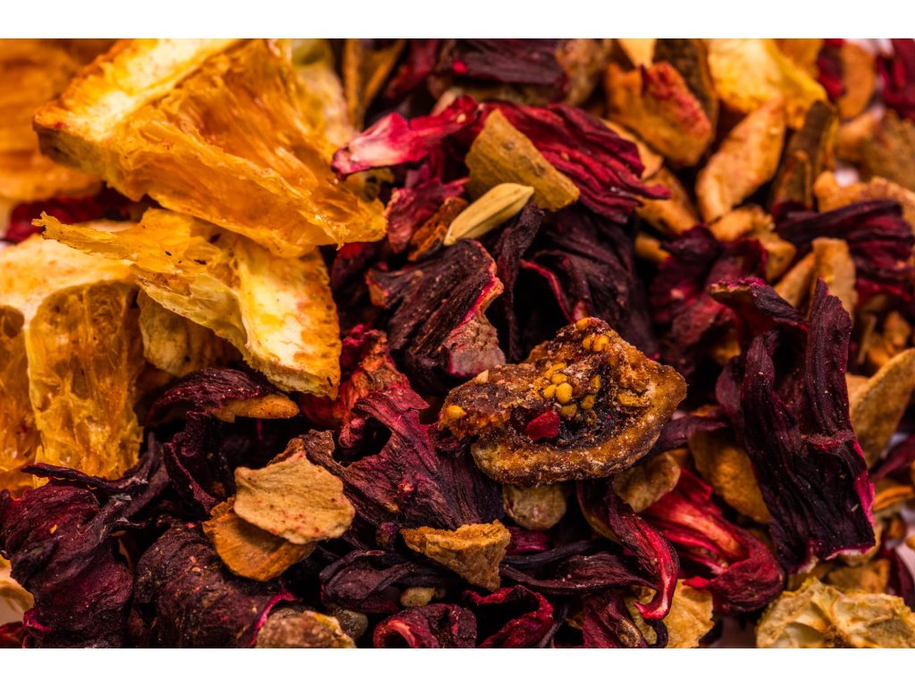 Ibištek, sušené jablko, sušený pomaranč, figy, škoricová kôra, sušená citrónová kôra, aróma.